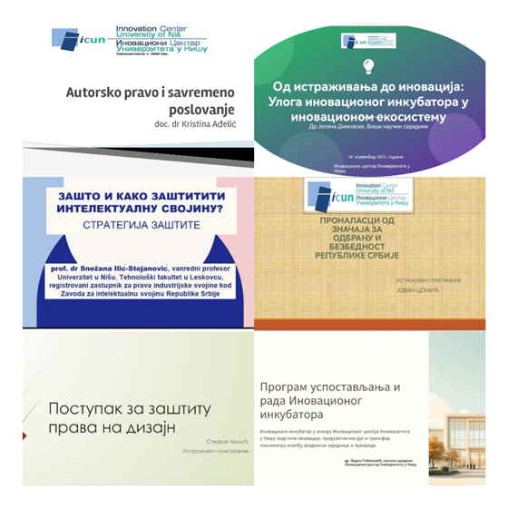 U Inovacionom centru Univerziteta u Nišu, dana 24. novembra 2025. godine, održan je Seminar pod nazivom „Inovacije kroz prizmu zaštite intelektualne svojine i Inovacionog inkubatora“. Seminar je organizovalo Odeljenje za intelektualnu svojinu, u saradnji sa Inovacionim inkubatorom Inovacionog centra Univeziteta u Nišu.